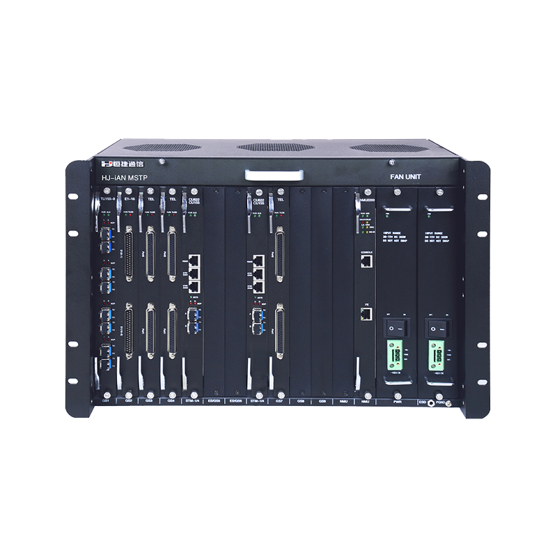 HJ-iAN2200 is a new generation centralized MSAP device, composed of a chassis and unit boards. The chassis adopts a 19-inch 7U plug-in design (chassis dimensions: 311MM*293MM*482MM), with a PGND screw and anti-static interface at the lower right corner of the chassis; the unit boards include a fan board, power board, network management board, SDH uplink board, GE Ethernet core aggregation board, service boards, etc. The fan board is located at the top of the device, providing ventilation and heat dissipation; the power board supplies +12V power to the device; the network management board provides network management functions; the SDH uplink board offers cross-connection and synchronous timing functions; the GE Ethernet core aggregation board provides Ethernet switching functions; the service boards include various service branch boards to meet customer needs.